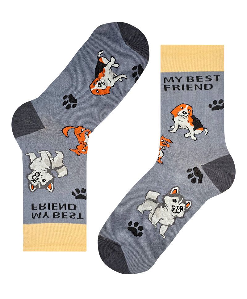 Представяме ви нашите очарователни чорапи, украсени със закачливи графики на кучета и надпис "My Best Friend". Те са идеални за всеки любител на домашни любимци и ще добавят доза радост и индивидуалност към вашия гардероб.